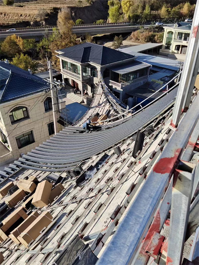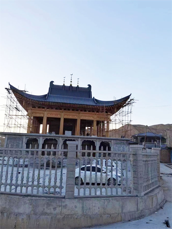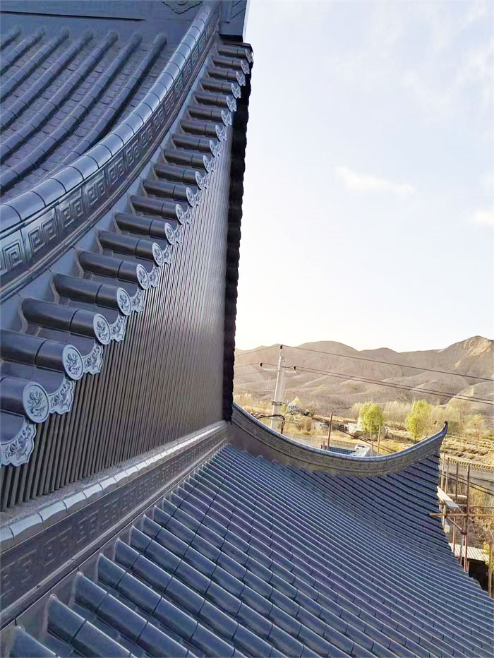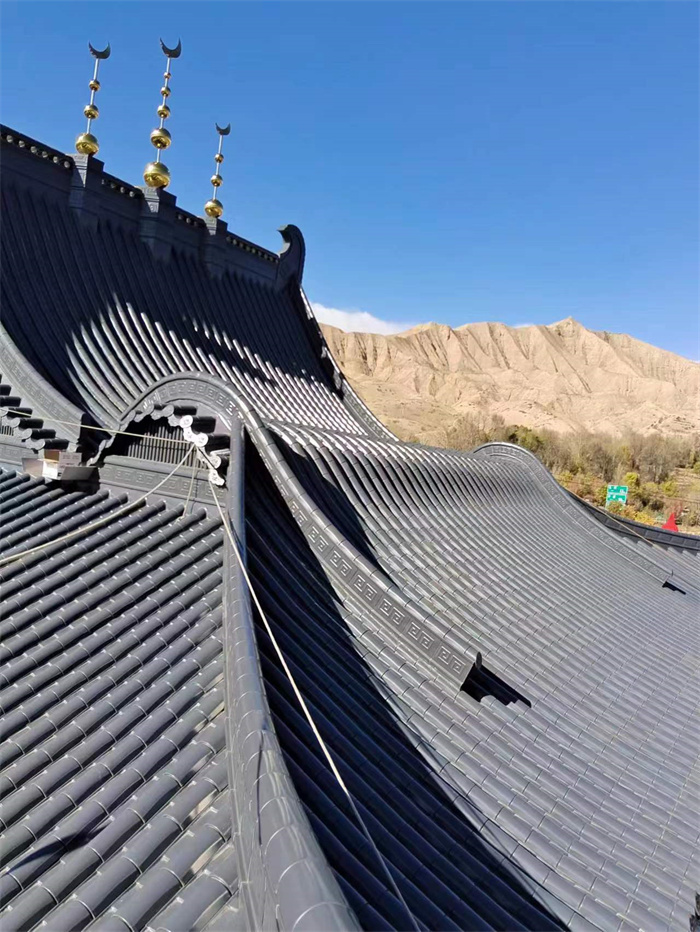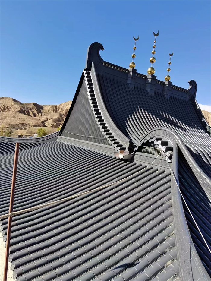 青海谷子灘清真寺大殿屋面古建筑鋁瓦工程;選用東申2號分體瓦,材質鋁鎂錳合金瓦,表面氟碳漆工藝;厚度1.2mm;顏色為灰色;整體屋面為新中式仿古風。