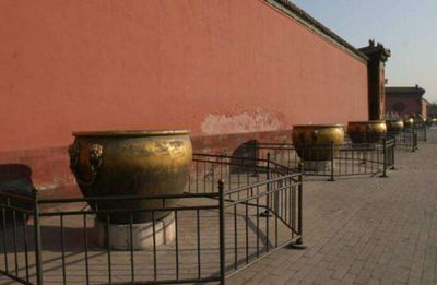 據《大清會典》記載,紫禁城內曾有大缸308尊。由于歷史的變遷,現還剩200余尊。在宮殿前設置的這些大缸,稱之為“門海”,每尊可貯水3000多升,過去由幾十個太監專門負責管理,每天派勞役從井內吊水,一擔一擔把缸打滿。夏天要保證水質干凈,沒有異味;冬天除在缸口加蓋之外,還在大缸外圍包上一層棉絮外套,在特別嚴寒的季節里,要把缸架在特制的石圈上,下燃炭火,晝夜不熄,以免缸水凍結。