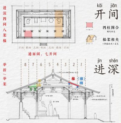 進(jìn)深:主要是指橫向梁架的深度。通過(guò)柱子之間的距離以及梁架椽子的數(shù)量來(lái)確定“進(jìn)深”的概念。