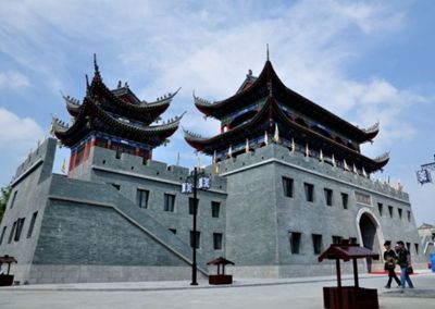 景墻在仿古建筑中的作用是分隔空間。我國古建筑講究“以小見大”,景墻在其中發揮了重要作用。照壁是景墻的一種,具有擋風,遮蔽視線的作用,墻面若有裝飾則造成對景效果。照壁可位于大門內,也可位于大門外,前者稱為內照壁,后者稱為外照壁。馬頭墻也是景墻的一種。其隨屋面坡度層層迭落,以斜坡長度定為若干檔,墻頂挑三線排檐磚,上覆以小青瓦,并在每只垛頭頂端設有搏風板(金花板)。